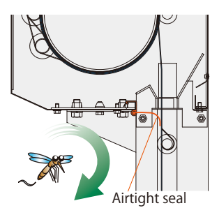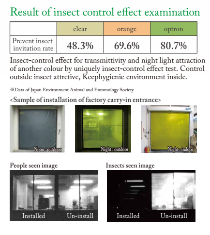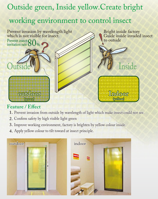 - Mành cửa được thiết kế đặc biệt, ngăn sự xâm nhập của côn trùng từ bên ngoài bằng cách cắt bước sóng ánh sáng mà côn trùng nhìn thấy được nhưng với con người thì không, điều này giúp giảm 80% sự xâm nhập của côn trùng, mành cửa có màu xanh khi nhìn từ bên ngoài. Khi nhìn từ bên trong mành cửa có màu vàng, côn trùng có thể nhìn thấy được, điều này giúp dẫn hướng cho côn trùng bay ra ngoài .
