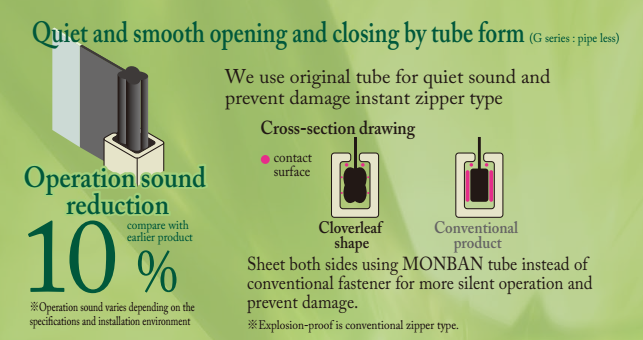 - Ngoài chức năng chống côn trùng hiệu quả, cửa cũng được thiết kế tối ưu để giảm tiếng ồn khi vận hành bằng cách giảm sự tiếp xúc giữa mành cửa và dẫn hướng cửa, theo kết quả kiểm tra, sau cải tiến, tiếng ồn giảm 10% so với các mẫu trước đó.