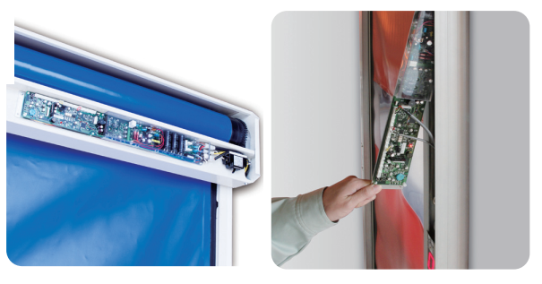 - Bộ điều khiển được tích hợp vào luôn hộp cửa cuốn hoặc ray cửa cuốn, không cần phải có 1 hộp điều khiển riêng, giúp giảm diện tích không gian, đi dây cho cửa.